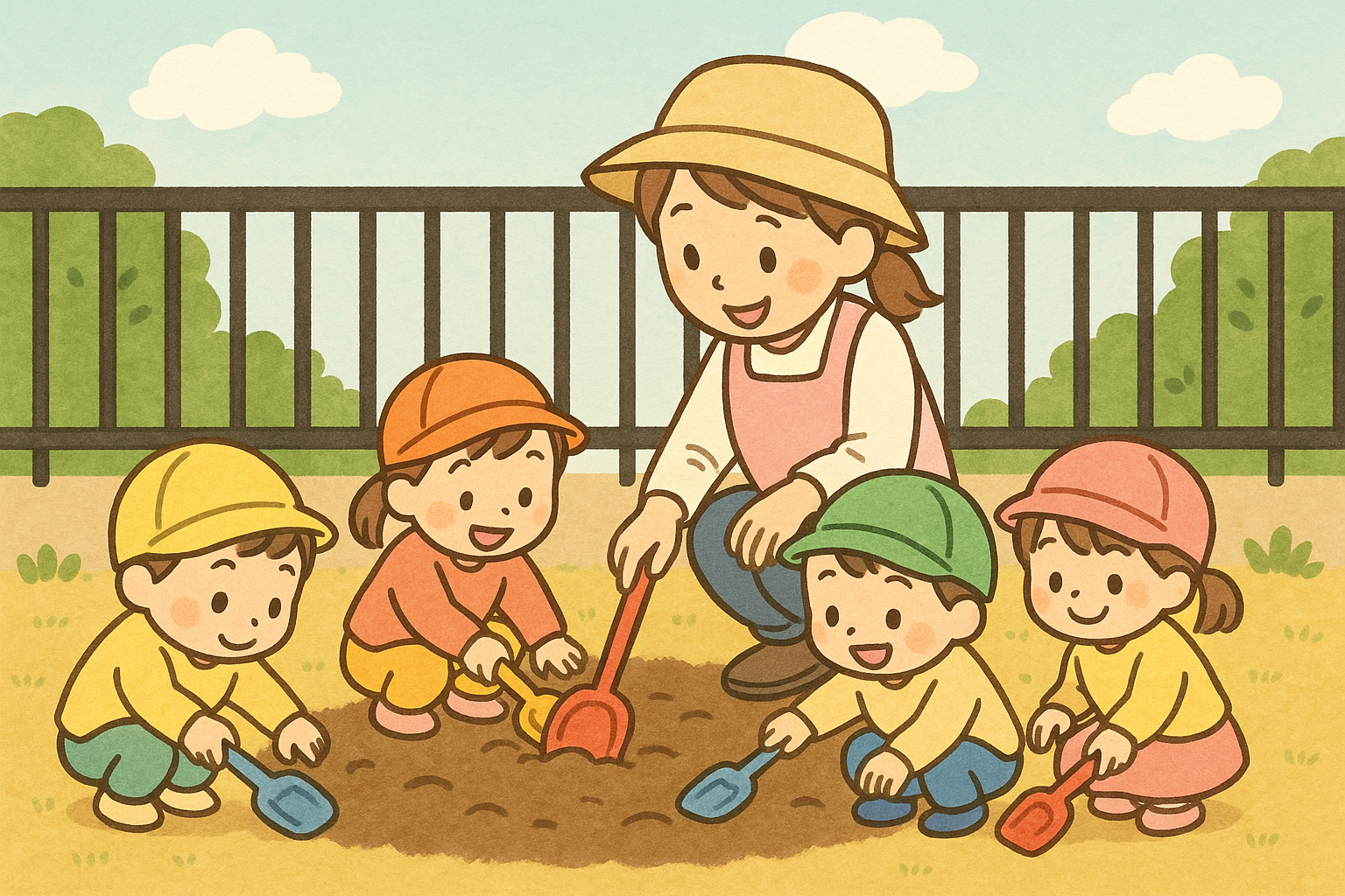 1歳児クラスの担任が園庭のフェンスのまわりをスコップでならしていると、数人の子どもたちが集まってきて、一緒にスコップで土遊びを始めた。
