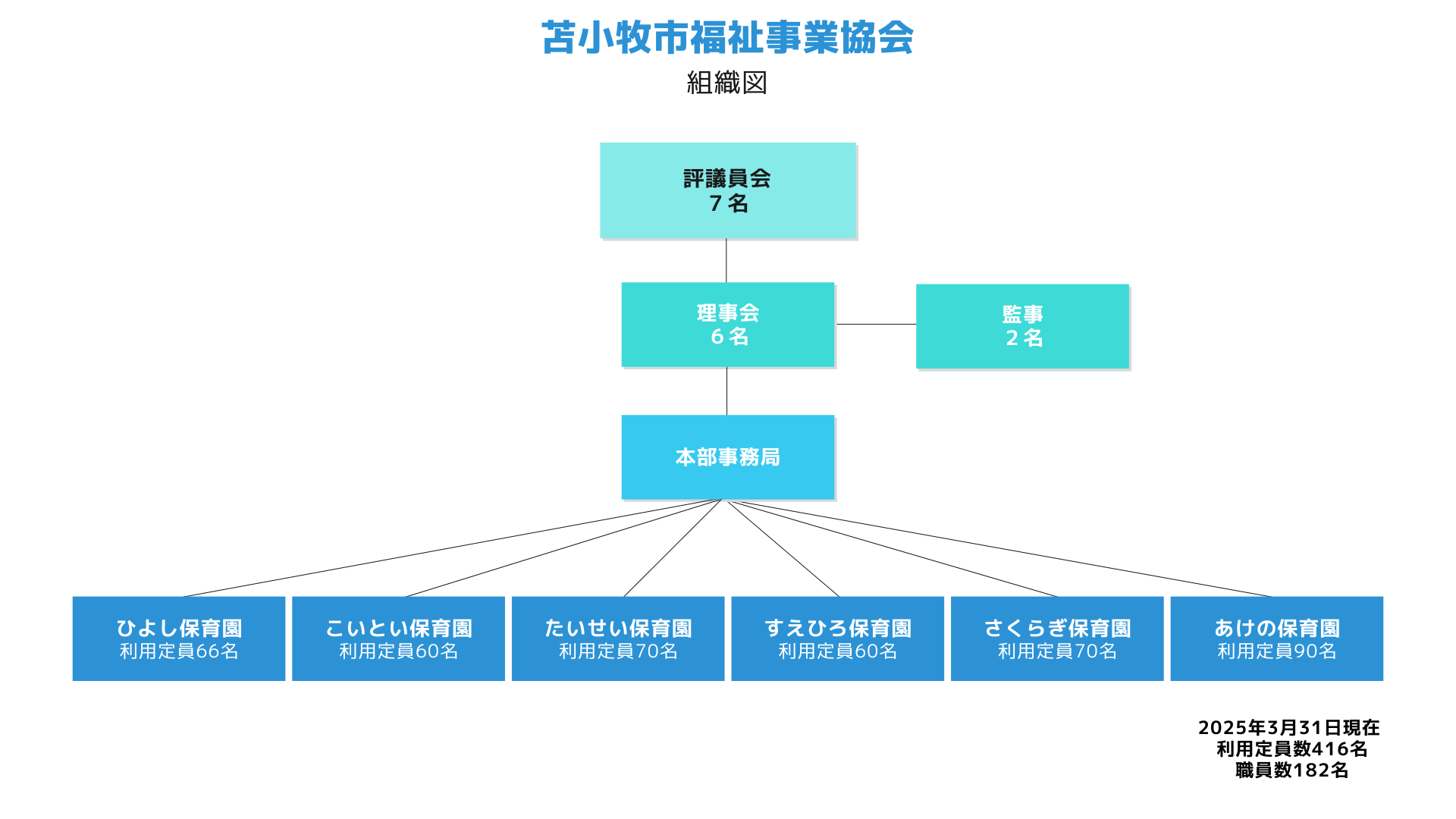 本法人は、昭和 51年 8月に社会福祉法人苫小牧市福祉事業協会として認可され、市内で 5カ所の保育園の運営を開始、その後、平成 24年 4月には市からあけの保育園の譲渡を受け、現在、6カ所の保育園を運営しています。